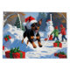 Un ilustracion vacacional reconfortante con un perro alegre jugando en la nieve, usando un sombrero de Santa y rodeado de coloridas cajas de regalos. En el fondo, los niños construyen un muñeco de nieve al lado de un árbol de Navidad cubierto de nieve, creando un alegre maravilloso país invernal. Perfecto para difundir alegría por las vacaciones y capturar la magia de los Navidades.