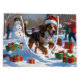 Un ilustracion vacacional reconfortante con un perro alegre jugando en la nieve, usando un sombrero de Santa y rodeado de coloridas cajas de regalos. En el fondo, los niños construyen un muñeco de nieve al lado de un árbol de Navidad cubierto de nieve, creando un alegre maravilloso país invernal. Perfecto para difundir alegría por las vacaciones y capturar la magia de los Navidades.