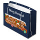 Esta bolsa de regalo está lista para ser personalizada con tu propio mensaje y cuenta con un ilustracion festivo de un RV de pan de jengibre. Este camper de clase C de galletas está decorado con hielo blanco y dulces de Navidades rojos y verdes. El gráfico se coloca sobre un fondo azul marino con el texto personalizado encima en letras blancas.