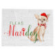 ¿Qué tan lindo es este pequeño Chihuahua con su gorra roja de Santa y su bufanda a rayas a juego? Envía un mensaje humorístico que hará reír a los amantes de las mascotas esta temporada navideña cuando elijas este fondo de madera y temática Fleas Navidog.