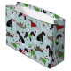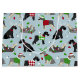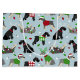 Los Navidades sabrosos Schnauzers con sal y pimienta, y los abrigos negros y plateados llevan sombreros de Santa, corderos y sudaderas de argyle sobre un fondo azul con adornos dispersos.