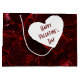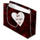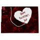 En este diseño destacan varios tonos rojos. El diseño es una foto digital de delicados violas. Los rojos oscuros de los cañones y los tonos rosa claro se unen para dar a esta bolsa de regalo un aspecto de neón. En la parte delantera y trasera de la bolsa hay un corazón blanco con un texto rojo profundo que dice: "FELIZ DÍA DE VALENTINE". Este texto se puede personalizar con su propio texto