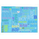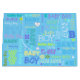 Hermosa composición con fuentes de diferentes colores sobre fondo azul, bolso de regalo de papel perfecto para un bebé recién nacido o una ducha de bebé