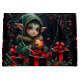 Cute Elf Child en Abrigo Verde con adorno de Navidad - Magico diseño de vacaciones de fantasía. Un niño elfo lindo con ojos grandes y orejas puntiagudas lleva un abrigo verde adornado con piel adornada con capucha y sostiene un adorno navideño naranja brillante. Rodeado de cajas de regalo con cintas rojas, ramas de pino y bayas, esta mágica escena festiva se siente festiva y mística. El marco oscuro y ornamentado con vistas a un bosque encantado hace de este hotel un lugar ideal para los amantes de la fantasía, los aficionados a los Navidades y el arte mágico de las vacaciones.