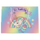 Esta bonita y colorida bolsa de regalo personalizado presenta un hermoso ilustracion de un arco iris unicornio y de colores pastel. Purpurina de oro falso acentúa las partes superior e inferior. Pequeñas estrellas de colores coincidentes rodean el arcoiris. Se imprime un cartel encima del unicornio con un nombre de ejemplo impreso debajo en un elegante tipo de letra morado. Puede personalizar la bolsa de regalo para incluir su propio nombre o texto personalizado.