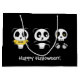 Dos pequeños pandas sentados en la oscuridad con un pequeño esqueleto. Una Panda lleva una camiseta amarilla con la palabra "meh".