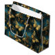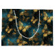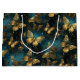 Una elegante y grande bolsa de regalo con un patrón de mariposas en brillantes tonos dorados y azules brillantes.