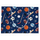 Este divertido patrón de equipo deportivo para niños tiene pelotas de fútbol, pelotas de fútbol, pelotas de béisbol, voleibol, palos y pollitos de hockey y bates de béisbol. El equipo atlético tiene un fondo azul oscuro. Es una gran adición a un niño o chica fiesta o celebración. También hace una linda adición a un cumpleaños, Navidades u otro regalo de vacaciones.