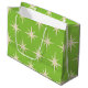 Se trata de elegantes estrellas atómicas blancas de mediados de siglo sobre fondo verde lima. Es una gran bolsa de regalo para temas retro fiesta