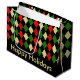 Este colorido diseño de arlequín funciona bien durante la temporada de Navidades y durante todo el año para cumpleaños, graduaciones, aniversarios y otras celebraciones. Los colores son el verde rojo, el negro y el beige dorado. Puede editar el texto de la parte delantera y trasera de esta bolsa de regalo reemplazando el texto de ejemplo que se muestra en la plantilla de diseño.