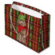 Un lindo Cockapoo marrón se sienta con un lindo gorra de invierno verde con un pom rojo y una bufanda roja a juego y está emparejada con mantas rojas y verdes en esta gran bolsa de regalo para los amantes del perro y de las mascotas.
