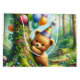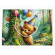 Un dulce cachorro de oso con un regalo de cumpleaños rodeado de globos de cumpleaños en azul, amarillo, verde, morado y rosa.