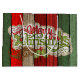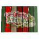 Hermoso, único, clásico, de moda, bonito y decorativo Navidades etiqueta de saludo de vacaciones con un clásico texto de la cita "Feliz Navidad" de color rojo oscuro, verde del bosque y blanco sobre un rústico fondo de patrón de tablones estilo casa de campo de madera templada.