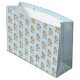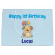 Large personalized gift bag - happy 1st birthday, boy: This cute gift bag for a little boy turning one features a happy puppy, a cake and balloons. Personalize it with the birthday boy's name to make it even more special. The back is full of little puppies joining the party :-) Also check out my matching birthday cards in various sizes. Also available for little girls in pink. Designed by Best Baby Gifts - given with love.