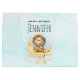 Gran bolsa de regalo con un bonito ilustracion acuático. Un adorable león con una corona pescando estrellas sentadas en una luna creciente descansando en una nube esponjosa. Ilustracion mágico de fantasía. Fondo de color azul claro.