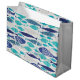 Gran bolsa de regalo brillante con una imagen, a ambos lados, de un surtido de peces en diferentes tonalidades de azul. Vea bolsas de regalo de medio, pequeño y vino a juego, confeti, etiqueta de favores de vieiras, etiqueta y papel de envoltura. Ver la colección completa de la bolsa de regalo bajo el mar en los TOQUES ESPECIALES | Sección de favoritos de partido.