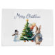 Peter el Conejo con globos y un árbol de Navidad y hombre de nieve Feliz Navidad