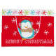 Este pequeño y feliz pingüino aparece en esta bolsa de compras. Está listo para la temporada de vacaciones con su bufanda a rayas, arbustos rosados y caña de caramelo. El fondo rojo está salpicado de copos de nieve blancos. La banda blanca se envuelve alrededor de la parte superior de la bolsa junto con coloridos copos de nieve. El texto de la parte inferior se puede personalizar.