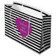 Bolsa de regalo personalizada con un corazón rosado sobre diseño de patrones rayados en blanco y negro. Para personalizar el texto en la parte delantera y trasera, simplemente escriba su propio nombre, texto y fecha en los campos de plantilla. Accesorios de fiesta a juego disponibles.