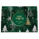 Un diseño elegante con pinos dorados, copos de nieve plateados y ramas sobre un fondo verde cazador y marcos redondos dorados. Puede personalizar esto con sus propios detalles o puede borrar cada texto si no desea que se escriba nada.
