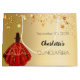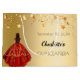 Un fondo de imitación dorada decorado con estrellas y un chica con una tiara y un vestido rojo. Personalizar y agregar nombre, fecha.