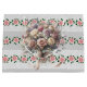 Una gran bolsa de regalo con rayas de rosas rosadas sobre encaje blanco con un centro de ramo de rosas para compromisos o regalos para la ducha de novia