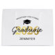 Bolsa de regalo para personalizados graduados con un gorro de graduación, 2025 en oro falso, nombre de escuela, nombre de estudiante y el título de licenciatura en letras.