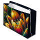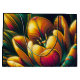 Esta obra de arte digital presenta una representación vibrante y abstracta de un tulipán en flor total. El diseño intrincado muestra una mezcla cautivadora de colores, como amarillos vivos, naranjas y toques verde azulados, creando un efecto visual impresionante.