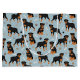Cute Rottweiler dogs sit and stand with black and tan coats with scattered dog bones and pawprints pattern.