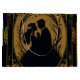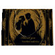 La elegante silueta de una novia y un novio rodeados de flores y adornos ornamentales. El diseño es una lujosa combinación de oro y negro, que desprende elegancia y refinamiento. Los detalles son muy detallados y le confieren un toque romántico y elegante a la invitación.