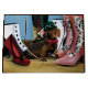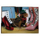Un perro dachshund está todo vestido con una corbata de arco y sombrero de punta listo para ir a caminar mientras espera pacientemente entre todas las zapatos y botas de damas.