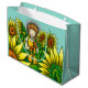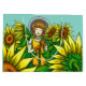 Un chica en un campo de girasoles en una cálida tarde de verano.