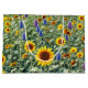 A vibrant field filled with bright yellow sunflowers and a mix of purple and blue flowers stretches into the distance