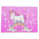 Un lindo unicornio sobre un arcoiris colorido en un cielo rosa y brillante.