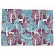A bright modern abstract pattern with white deer leaping and prancing against a purple background filled with turquoise blue and white trees.