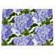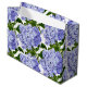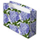 Esta bolsa de regalo se muestra en un color blanco en un acabado brillante con una hermosa marca de flores de lavanda azul hidrangea.