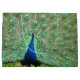 Un pavo real con cabeza y cuello azul brillante que sobresalen contra las plumas de cola se abalanzan para mostrar los "ojos". Imagen de ambos lados.