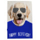 Perro Golden Retriever con camiseta azul y gafas de sol aviador para el cumpleaños. El texto es editable. Se puede cambiar el fondo.