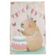 Este capibara, un ilustracion original, acoge a los huéspedes para celebrar su cumpleaños. El capibara, adornado con un gorra fiesta repleto de velas, sostiene alegremente un trozo de pastel. La escena se completa con un bonito pastel de cumpleaños de dos niveles, decorado con tonos pastel de rosa, azul y blanco, con velas vibrantes. El ambiente es alegre gracias a sus mariposas rosas y azules, sus motivos florales y sus numerosos carteles coloridos. Perfecto para celebraciones de cumpleaños, invitaciones a fiestas o mercadería temática, este encantador diseño exuda diversión y festividad.
