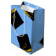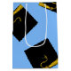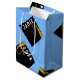Bolsa creativa de regalo con tapa de graduación en negro y oro sobre fondo azul claro. Editar texto para añadir su nombre y el año de clase superior.