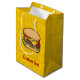 Ilustracion personalizado Cheeseburger. Fondo del patrón de comida basura amarilla sin costuras. Texto personalizado en ambos lados.