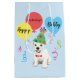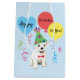 Felices saludos de cumpleaños con este lindo diseño que presenta un alegre y fiesta cachorro del Territorio Blanco de la Montaña Occidental, vestido de gorra y rodeado de coloridos globos y serpentines. "Feliz cumpleaños, [nombre]" delante y "¡Feliz cumpleaños a ti!" detrás. El nombre se puede cambiar fácilmente; sólo tiene que hacer clic en el botón de personalización.