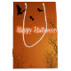 Una silueta ilustracion de Halloween: Murciélagos negros espeluznantes y árboles espeluznantes con un saludo "Happy Halloween" con un fondo místico.