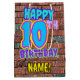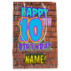 La parte delantera de este divertido diseño de bolsos de regalo con temática de cumpleaños incluye el mensaje "FELIZ CUMPLEAÑOS 10″, con un colorido, vibrante arte urbano e inspirado en el graffiti, además de un nombre de destinatario personalizado. El fondo está decorado con un patrón inspirado en el aspecto de una pared de ladrillo. Una vibrante bolsa de regalo con tema de cumpleaños como esta podría ser usada cuando se da un regalo o regalo para la celebración del décimo cumpleaños de alguien. [~Z0000536]