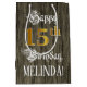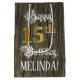 Este elaborado y lujoso diseño de bolsos de regalo con temática de cumpleaños incluye el mensaje "Feliz cumpleaños número 15", junto con un nombre de destinatario personalizado. Parte del mensaje está en un texto ornamentado estilo escritura, el gran número "15th" presenta un patrón de aspecto falso/imitación de inspiración dorada, y el fondo tiene un patrón de imitación/imitación inspirado en los granos de madera. Una bolsa de regalo con tema de cumpleaños como esta puede ser una manera respetable de envolver un regalo o regalo para celebrar el décimo quinto cumpleaños de alguien. [~Z0000562]