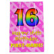 Este divertido, alegre y optimista diseño de bolsas de regalo de cumpleaños presenta un gran número "16" con un patrón inspirado en el gradiente del espectro del arco iris, junto con el mensaje "Feliz cumpleaños número 16", y un nombre de destinatario de personalizable. También tiene un fondo de amor con formas cardíacas de color rosa en un patrón rayado. Una bolsa de regalo feliz como esta podría ser una manera divertida de envolver un regalo de cumpleaños o un regalo para alguien que esté celebrando su 16 cumpleaños. [~Z0000511]