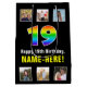 Este atractivo y divertido diseño de bolsos de regalo con temática de cumpleaños presenta un gran número de "19" con un vibrante patrón de gradiente inspirado en el espectro del arco iris, además del mensaje "Feliz cumpleaños número 19", y un nombre de destinatario del personalizable. Las fotos de arriba y abajo del mensaje pueden ser personalizadas, tal vez con fotos del destinatario, la familia y amigos del destinatario, y/o el(los) remitente(s) del regalo. Un bolso de regalo atrevido con tema de cumpleaños como este podría ser una manera divertida de envolver un regalo o regalo que se le está dando a alguien que está celebrando su decimonoveno cumpleaños. (Fotografía © Storytree Studios, Stanford, CA.) [~Z0000669]