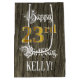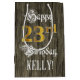 Este elaborado y elegante diseño de bolsitas de regalo de cumpleaños incluye el mensaje "Feliz cumpleaños número 23", y un nombre de destinatario del personalizable. Parte del mensaje está en un texto con estilo de script ornamentado. El gran número 23 presenta un estilo de imitación dorado. El fondo tiene un patrón falso/imitación inspirado en los granos de madera. Una bolsa de regalo con tema de cumpleaños como esta puede ser una manera respetable de envolver un regalo o regalo para celebrar el cumpleaños 23 de alguien. [~Z0000562]