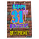 La parte delantera de este divertido diseño de bolsos de regalo con temática de cumpleaños incluye el mensaje "FELIZ CUMPLEAÑOS 31", que tiene un colorido, vibrante, arte urbano urbano e inspiración de graffiti, además de un nombre editable para el destinatario. El fondo está decorado con un patrón inspirado en el aspecto de una pared de ladrillo. Una bolsa de regalo colorida como esta podría ser usada cuando se le dan regalos al envasado a alguien en celebración de su 31º cumpleaños. [~Z0000536]