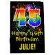 Este divertido, emocionante y colorido diseño de bolsas de regalo con la temática del cumpleaños incluye un gran número de "45" con un patrón de estilo gradiente del espectro del arcoiris, junto con el mensaje "Feliz cumpleaños número 45", y un nombre editable del destinatario. También tiene un colorido estallido de fuegos artificiales de celebración inspirados en el fondo. Una bolsa de regalo como esta podría ser usada para envolver regalos que se le dan a alguien en celebración de su 45 cumpleaños. [~Z0000509]